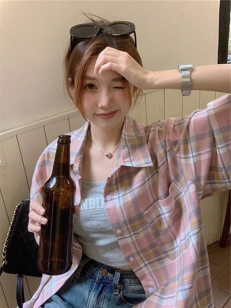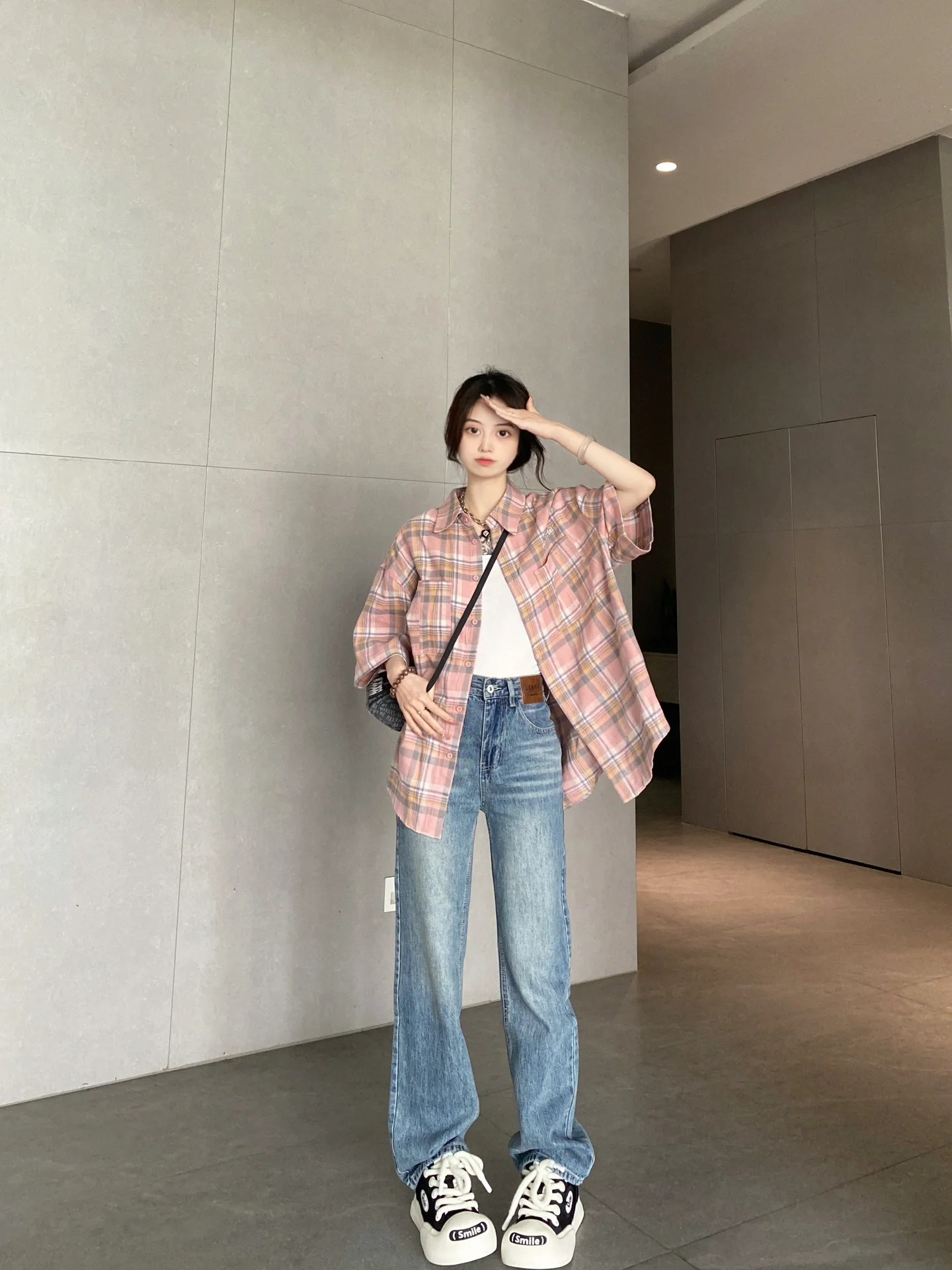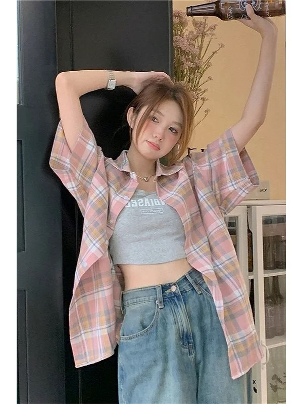 American Retro Pink Plaid Shirt Women's Summer Senior Design Sense Small Casual Short-Sleeved Shirt